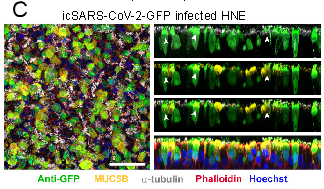 文章利用感染性克隆,构建了表达绿色荧光蛋白(GFP)的新冠病毒感染采自不同呼吸道区域的人原代细胞、COVID-19尸检组织样品染色等方法,鉴定出新冠病毒在人类呼吸道从鼻腔至肺泡上皮细胞中的感染能力呈递减趋势。并观察到了新冠病毒感染的细胞,在气管上皮主要为纤毛细胞,在肺泡主要为2型肺泡细胞。这些结果验证了ex vivo染色等准确性。