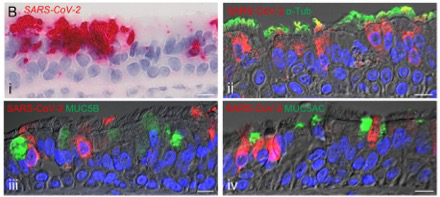 COVID-19病人尸检呼吸道样品中的新冠病毒与纤毛细胞、粘液分泌细胞染色