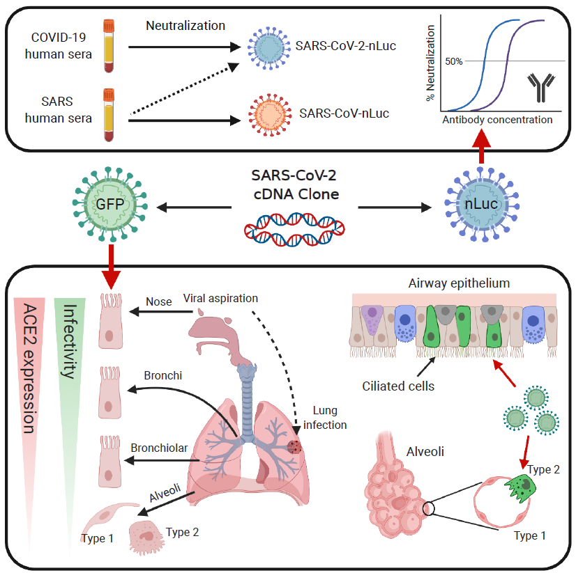 该文章综合性地报道了新冠病毒反向遗传系统、呼吸道组织嗜性、中和抗原性等方面的发现。该研究中所建立的方法和制备的工具,为新冠病毒等基础及转化医学研究提供了重要的技术支持。