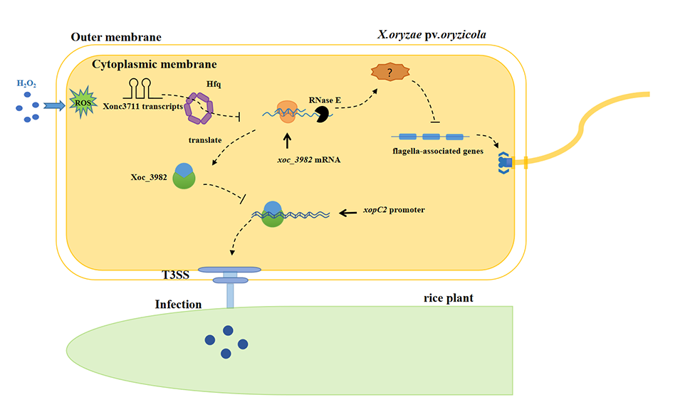 原核生物和真核生物中除了三种经典的 RNA,如 tRNA, rRNA,和 mRNA 外,还存在着一类新型的具有重要调控功能的非编码RNA(ncRNA),在细菌中被统称为 small RNA(sRNA),大小在 50-500nt 之间,主要作用方式是通过碱基互补配对与靶标基因 mRNA结合,进而影响 mRNA 的稳定性和翻译从而在转录水平上调控基因表达。研究团队发现sRNA Xonc3711通过碱基互补配对靶标DNA结合蛋白Xoc_3982影响其转录水平,ChIP-Seq表明Xoc_3982能够与三型效应因子XopC2结合从而影响其致病性。sRNA Xonc3711通过增加生物膜的形成来增加氧化应激耐受性和和在水稻上的毒性(图)。目前对于稻黄单胞菌稻生致病变种Xoc中sRNA的生物学功能仍处于研究初始阶段,因此开展sRNA 的研究,并发现具有重要功能的 sRNA,对进一步揭示细菌致病机理等和防控所致的植物病害提供了新的思路。