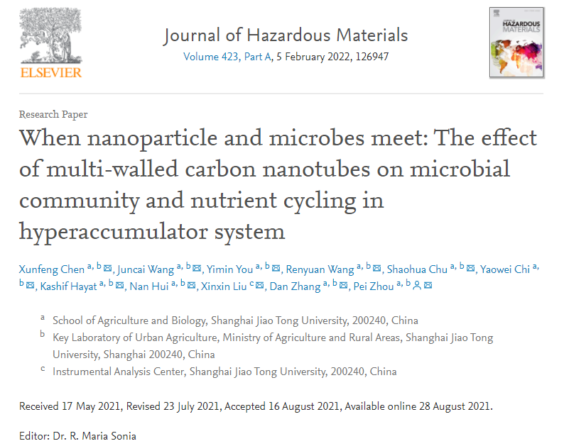 近日,上海交通大学农业与生物学院周培教授团队在生态环境领域国际著名期刊Journal of Hazardous Materials (中科院一区Top)在线发表了题为When nanoparticle and microbes meet: The effect of multi-walled carbon nanotubes on microbial community and nutrient cycling in hyperaccumulator system的研究论文。研究探讨了多壁碳纳米管对植物根际微环境的影响,从土壤微生物和营养循环角度揭示多壁碳纳米管的促生机理。