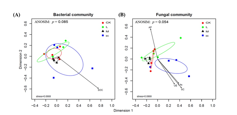 Fig. 1 NMDS (non-metric multidimensional scaling) ordinations and ANOSIM (analysis of similarity) test showing the difference of soil microbial community structure among different MCNT treatments.