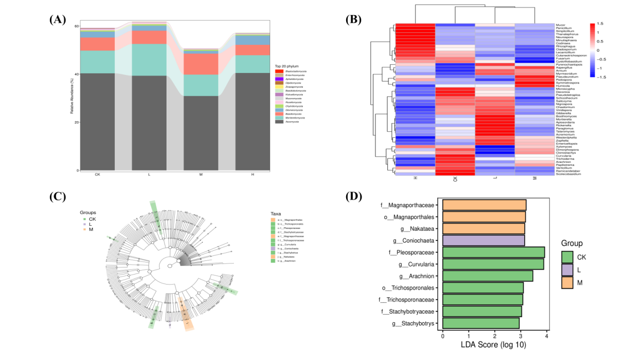 Fig. 3 Soil fungal taxonomic composition and LEfse (LDA Effect Size) analysis.