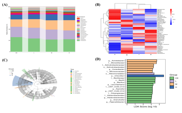 Fig.2 Soil bacterial taxonomic composition and LEfse (LDA Effect Size) analysis.