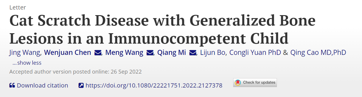 近日,国家儿童医学中心(上海)、上海交通大学医学院附属上海儿童医学中心感染科曹清教授团队联合上海交通大学农业与生物学院袁聪俐研究员团队在国际期刊《Emerging Microbes & Infections》杂志在线发表了题为“Cat Scratch Disease with Generalized Bone Lesions in an immunocompetent child”的临床研究成果。该研究首次系统描绘了免疫功能正常的“猫抓病”患儿出现全身骨骼损害和内脏损害的临床特征,并详细阐述了导致骨骼损害的巴尔通体感染的流行病学、病原学、临床特征及诊治现状。