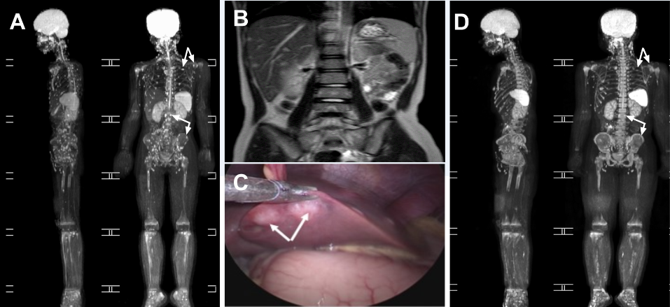 图1. 汉塞巴尔通体感染所致全身骨骼损害及内脏损害(A、B、C),经多西环素治疗6周后全身骨骼损害恢复情况(D)