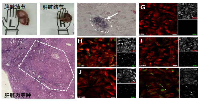 图2. 汉塞尔巴尔通体感染组织病理显示肉芽肿性炎症(图E)、用小鼠抗汉塞尔巴尔通体多克隆抗体在活检肝组织中检测汉塞尔巴尔通体杆菌(图F)、免疫荧光法确定患儿血清中高滴度汉塞巴尔通体抗体(图G-K)