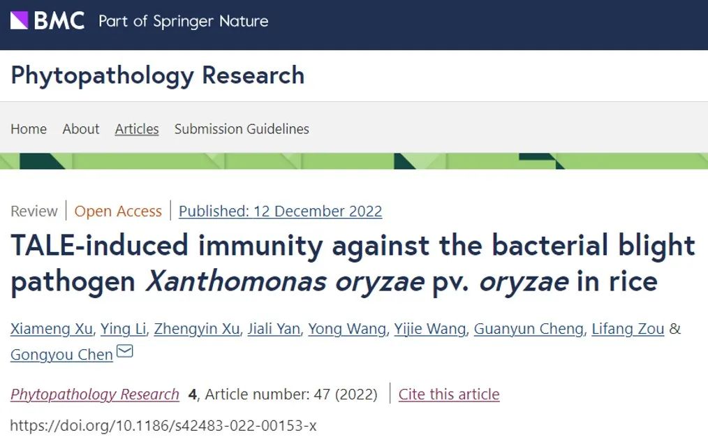 Phytopathology Research—陈功友团队综述TALE蛋白诱导水稻抗白叶枯病研究进展