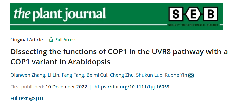 近日,上海交通大学农业与生物学院尹若贺课题组在The Plant Journal杂志发表了题为“Dissecting the functions of COP1 in the UVR8 pathway with a COP1 variant in Arabidopsis”的研究论文,揭示了COP1在UVB信号通路的多重作用 (Zhang et al., 2022) 。