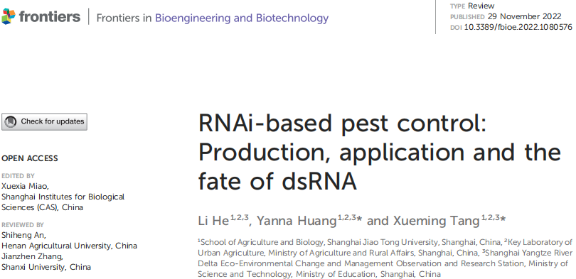 Frontiers in Bioengineering and Biotechnology—唐雪明团队综述RNA干扰技术用于害虫防治的研究及应用进展