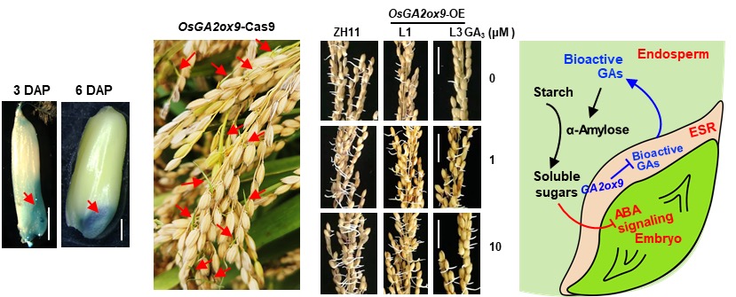 近日,上海交通大学农业与生物学院薛红卫团队研究揭示了水稻OsGA2ox9通过调控种子中的GA代谢,影响α-淀粉酶活性和可溶性糖含量,进而与ABA信号协同调控种子休眠,为赤霉素如何协调胚胎发育和种子萌发提供了线索,也为种子休眠性改良和降低穗发芽提供了基因储备。相关研究成果在线发表在植物学知名期刊《Plant Biotechnology Journal》上。