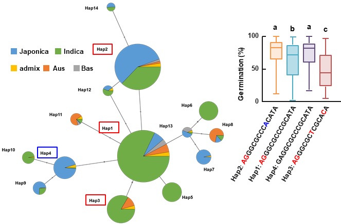 图2 OsGA2ox9单倍型网络及主要单倍型Hap1-4的平均萌发率
