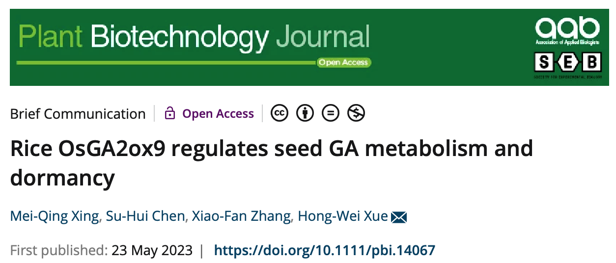 Plant Biotechnology Journal—薛红卫团队揭示赤霉素代谢酶GA2ox9调控水稻种子休眠和萌发的机制