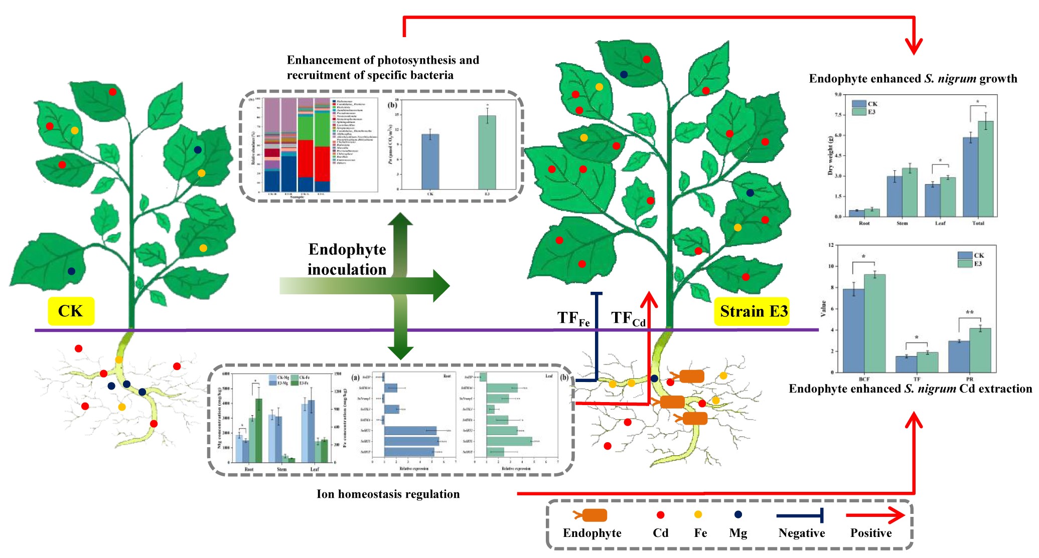 本研究在原生镉污染土壤中,将筛选获得的龙葵根内促生菌Pseudomonas sp. E3接种龙葵,发现E3菌株可定殖在龙葵根内,并显著提高龙葵对镉的萃取效率。通过元素分析、关键酶基因转录表达分析、16S rDNA高通量测序分析等,发现接种内生菌E3后龙葵重新分配了营养元素在根、茎、叶内的比例,尤其是对Fe2+、Mg2+吸收转运的调控,推测其与大量Cd2+“搭载”二价阳离子转运蛋白通道有关。同时,植物还通过提高叶片光合作用强度抵御大量镉富集,并刺激叶片分泌淀粉酶分解多余的淀粉,防止抗逆性功能物质淀粉的过度堆积,有效维持叶片镉积累和光合作用之间的平衡。此外,接种内生菌E3还重塑了龙葵各部位的内生细菌群落结构,尤其在植物根内富集了更高丰度的Pseudonocardiaceae和Halomonas,上述科属细菌有利于协助植物对营养元素及镉离子的吸收转运,并能提高宿主植物抗逆性、促进植物生长。该项研究从植物内部平衡调控层面深入解析了内生菌强化超积累植物萃取镉的作用机制,为微生物-植物联合修复重金属污染土壤提供了新思路。