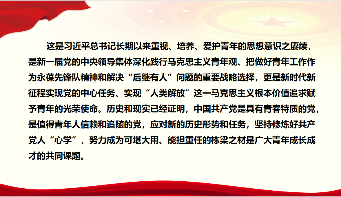 舒雅文同志作主题汇报。舒雅文同志总结了新一届党的中央领导集体深化践行马克思主义青年观、把做好青年工作作为永葆先锋队精神和解决“后继有人”问题的重要战略选择,是新时代新征程实现党的中心任务、实现“人类解放”这一马克思主义根本价值追求赋予青年的光荣使命。在这一使命号召下,青年人首先应当学习掌握发展着的马克思主义的道理学理哲理。学习继承马克思主义,是新时代好青年向上生长的本源力量,也是青年人守正创新引领实践的使命担当。