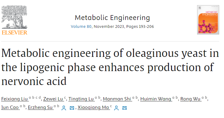 2023年10月10日,上海交通大学农业与生物学院马晓强研究组联合南京林业大学轻工与食品学院苏二正研究组在合成生物学与代谢工程领域权威期刊《Metabolic Engineering》在线发表了“Metabolic engineering of oleaginous yeast in the lipogenic phase enhances production of nervonic acid”,突破了产油酵母脂质积累阶段超长链不饱和脂肪酸生物合成的瓶颈,使目标产物神经酸(Nervonic acid, C24:1, n-9)占总脂肪酸的百分比达到46.3 %,发酵水平达到44.2 g/L,为富含神经酸功能性油脂的规模化微生物发酵生产奠定了基础。