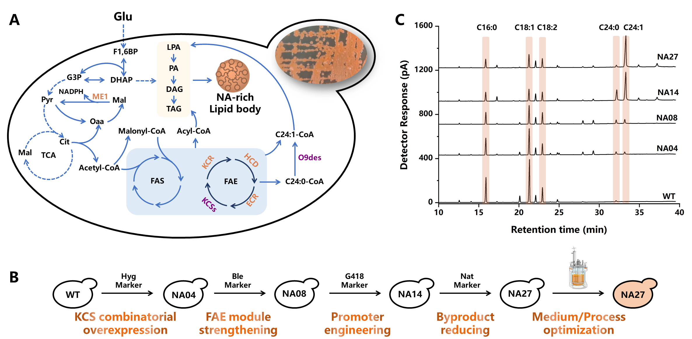 超长链不饱和脂肪酸在认知改善、大脑发育和脑部疾病治疗方面具有特定的生物学功能。2017年,植物源神经酸已经被我国卫健委批准为新食品原料(卫健康,2017年第7号文)。神经酸的获取目前主要来源于蒜头果、元宝枫和文冠果等经济林果。植物源神经酸生产存在气候依赖性强、培育难度大、占用耕地及生长周期长等问题,因此通过合成生物学与代谢工程技术改造产油酵母是实现功能性脂肪酸的商业化生产的有效途径之一,也是践行“大食物观”的必由之路。然而,工程化改造产油酵母合成超长链单不饱和脂肪酸的报道中,油脂积累期间往往不能有效实现C18到C24碳链延伸,限制了超长链单不饱和脂肪酸的合成。产油酵母合成大量脂肪酸通常受到严格的代谢调控,只有在菌体进入油脂积累阶段才会大量合成,因此如何有效重构油脂积累阶段的代谢网络是实现超长链单不饱和脂肪酸高效生物合成的瓶颈问题。