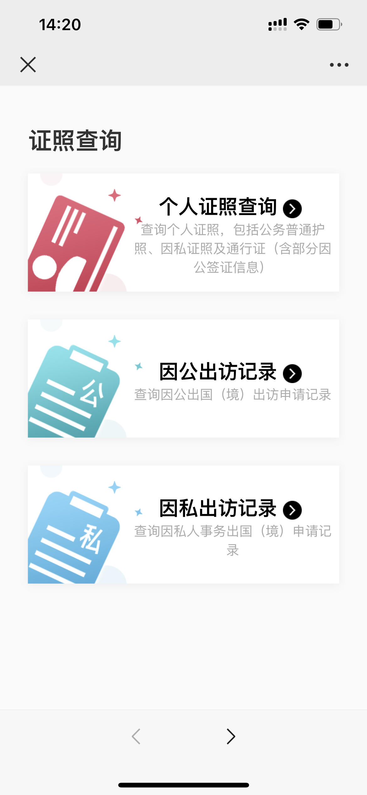 如图所示,点击“因公签证-证照查询”,即可查询已上交的因公护照、因私护照情况。还可查询签证信息、出访记录等其他信息。