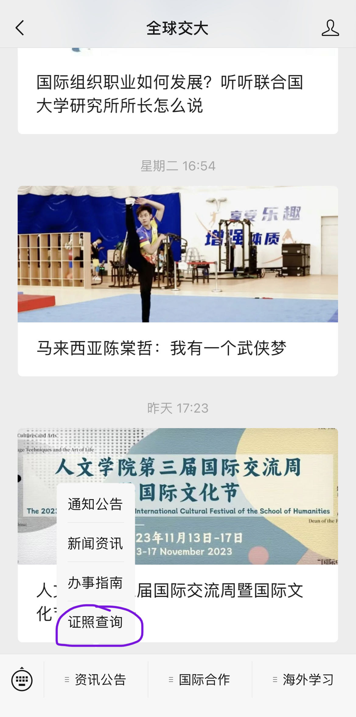 关注“全球交大”公众号,在下部菜单栏点击“资讯公告-证照查询”,即可查询个人证照、因公出访记录和隐私出访记录。