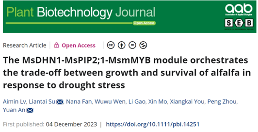 植物如何平衡生长和胁迫应答是目前非生物胁迫研究领域的热点问题。2023年12月4日,上海交通大学农业与生物学院安渊教授团队在Plant Biotechnology Journal在线发表了题为The MsDHN1-MsPIP2;1-MsmMYB module orchestrates the trade-off between growth and survival of alfalfa in response to drought stress的研究论文。该研究探明了紫花苜蓿生长和干旱胁迫响应平衡的重要基因调控模块MsDHN1-MsPIP2;1-MsmMYB-MsCESA3/MsCESA7,揭示了平衡紫花苜蓿生长和干旱胁迫响应的分子机制。