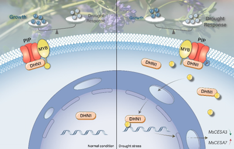 脱水素(Dehydrin,DHN)是植物中一类重要的逆境响应蛋白,而水通道蛋白(PIP)是一类参与水分、草酸、活性氧等转运的蛋白。该研究首先发现DHN1与PIP2;1在质膜互作,正向调节苜蓿的耐旱能力,并且,正常环境下DHN1、PIP2;1均与质膜定位的mMYB转录因子互作,但在干旱胁迫下,PIP2;1蛋白第272位氨基酸(Ser272)发生磷酸化,诱导MYB转录因子转移到细胞核。进一步研究发现,MYB与DHN1的C端在细胞核内发生互作,增强了MYB的转录调控活性,调控下游靶基因MsCESA3下调和MsCESA7上调表达,从而影响根系初生细胞壁和次生细胞壁的形成,继而影响苜蓿生长。