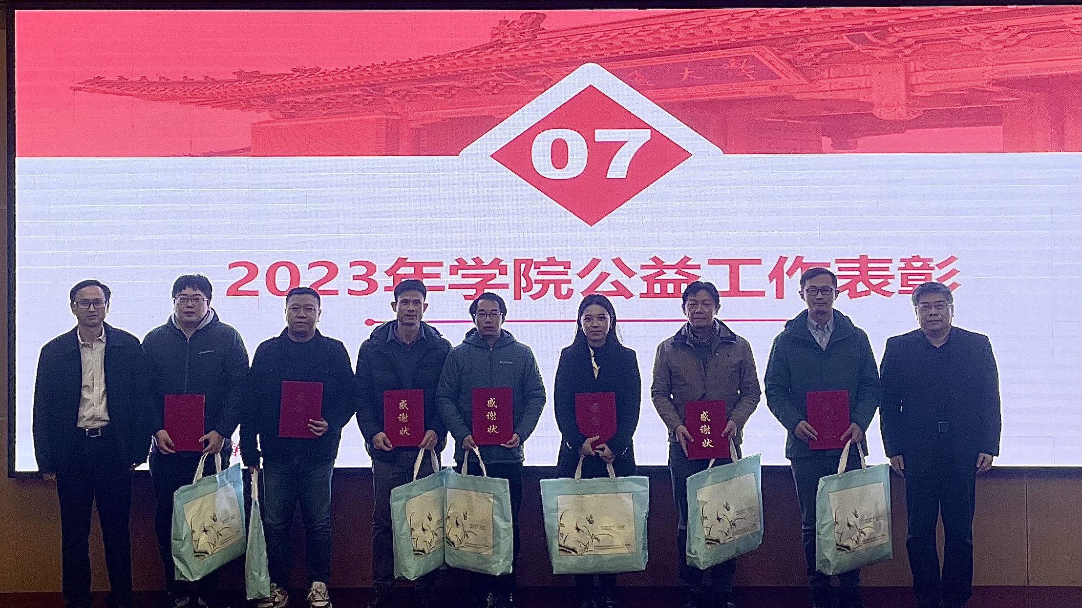李文纯宣读了2023年学院公益工作表彰决定,侯士兵、薛红卫为获奖教师颁发证书并合影留念。