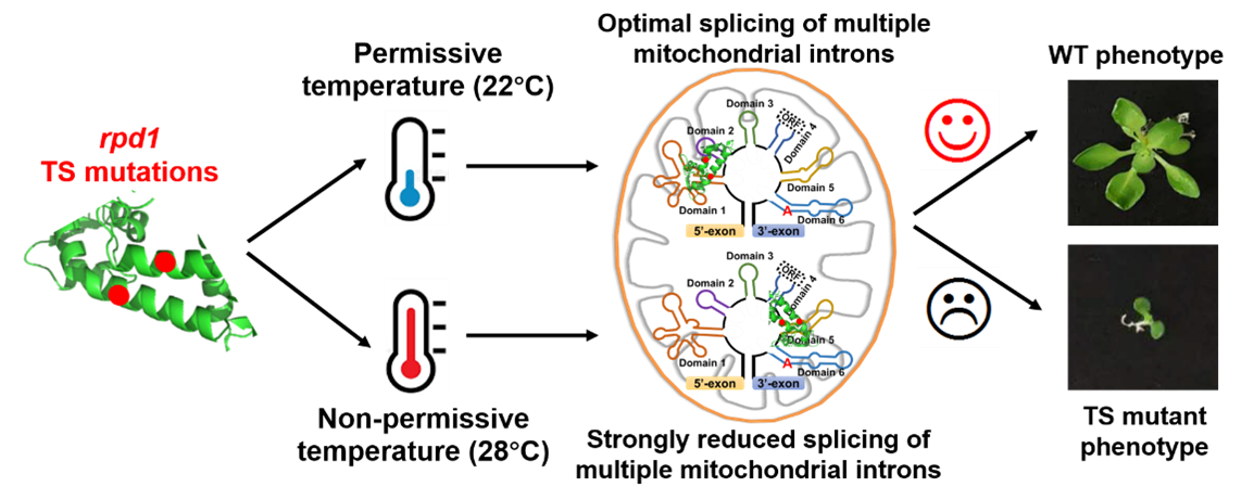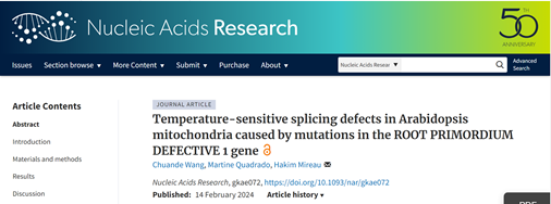 2024年2月14日,上海交通大学农业与生物学院王传德课题组在核酸领域顶级期刊 Nucleic Acids Research 发表了题为 “Temperature-sensitive splicing defects in Arabidopsis mitochondria caused by mutations in the ROOT PRIMORDIUM DEFECTIVE 1 gene”的研究论文,揭示了PORR蛋白家族的RPD1蛋白直接参与多个线粒体内含子的剪接。研究指出,RPD1基因的两个温度敏感性突变对其参与内含子剪接的功能产生了影响,从而证明了高温条件下突变体的不定根发育异常主要是由于RPD1与线粒体内含子的结合能力降低,进而损害了线粒体的功能,而并非由于RPD1直接参与调控拟南芥不定根的形成。此外,RPD1蛋白与目标内含子的多个不同区域相结合,表明RPD1在内含子剪接过程中可能具有多样性机制。