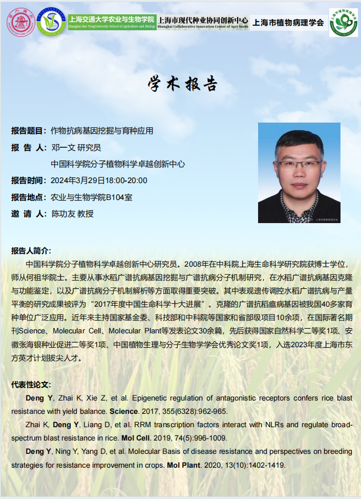 报告题目:作物抗病基因挖掘与育种应用