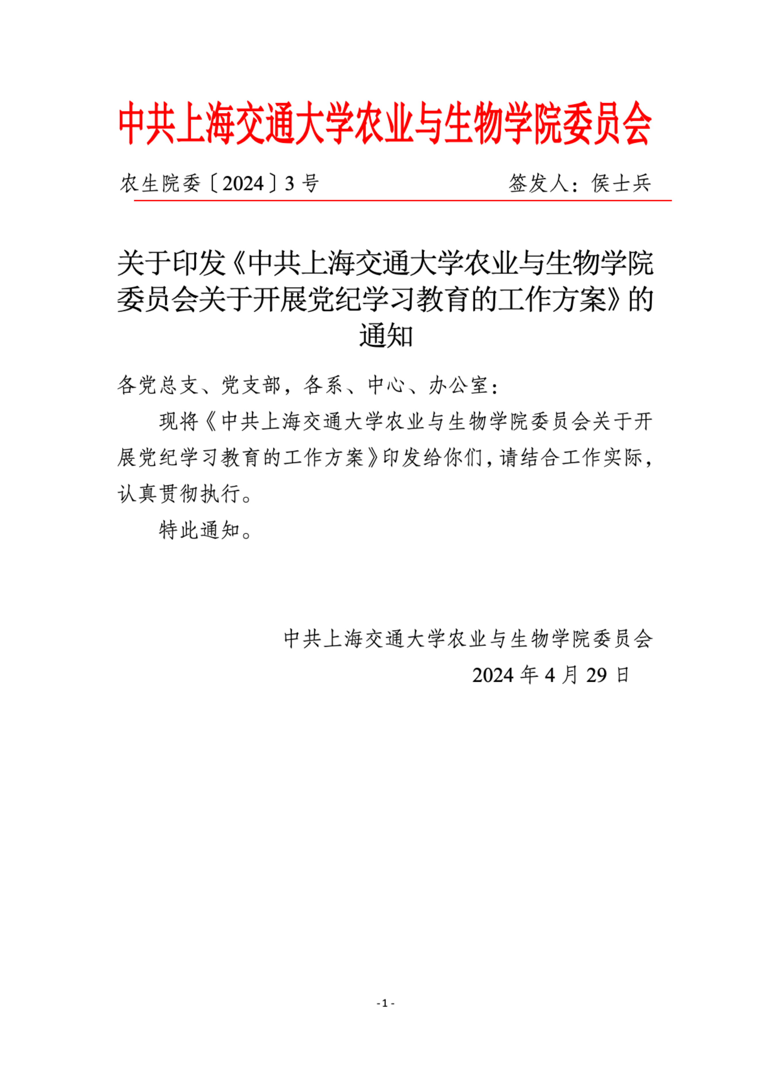 农生院委〔2024〕3号 关于印发《中共上海交通大学农业与生物学院委员会关于开展党纪学习教育的工作方案》的通知