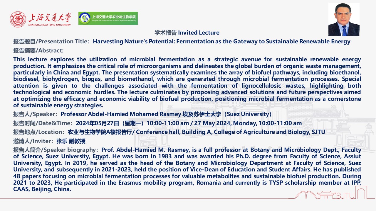 报 告 地 点:农业与生物学院A楼报告厅/Conference hal, BuildingA,College ofAgriculture and Biology,SJTU