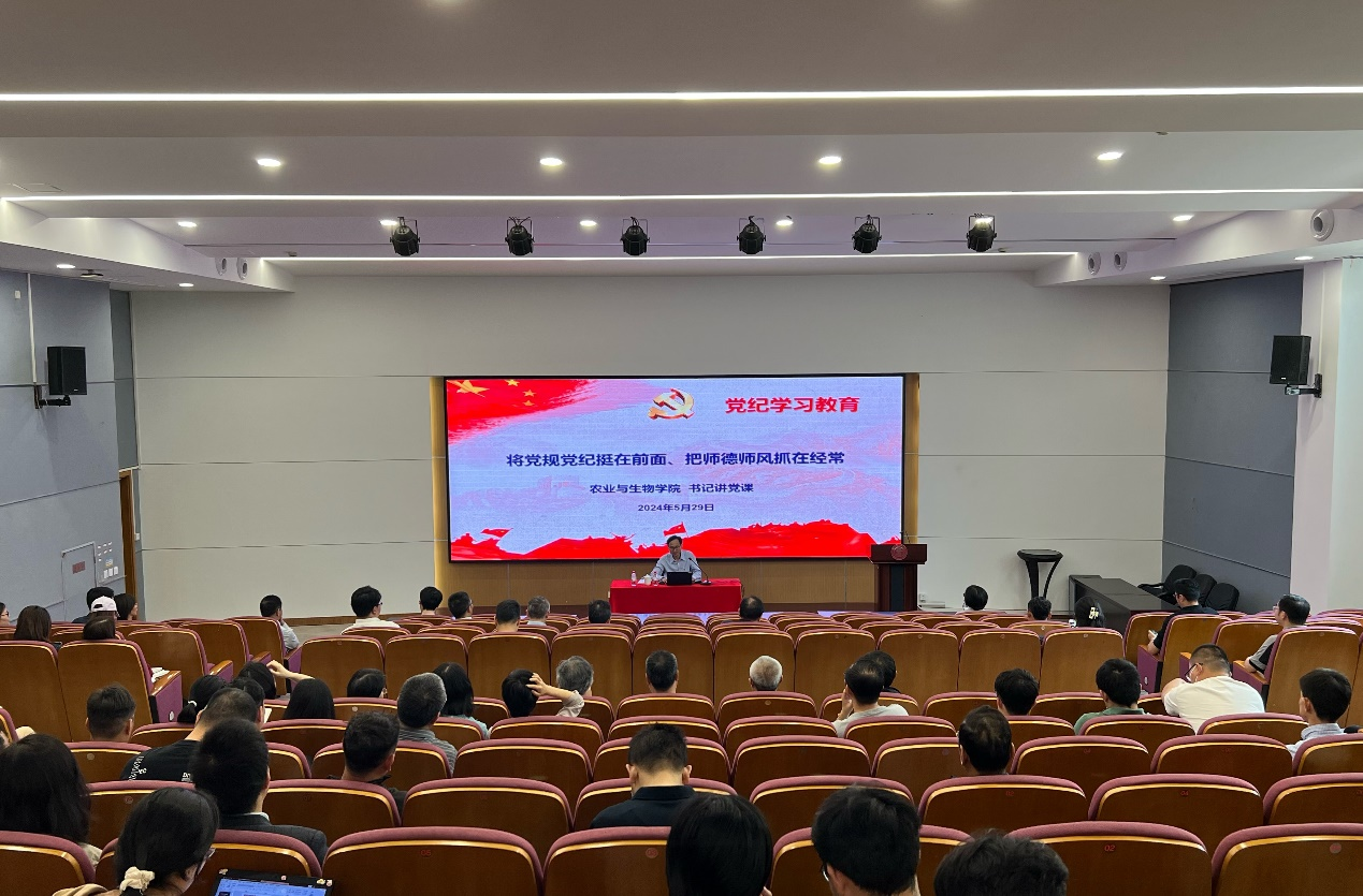 5月29日,农业与生物学院党纪学习教育专题党课在学院A楼报告厅举行,院党委书记侯士兵以“把党规党纪挺在前面、把师德师风抓在经常”为题讲授纪律党课,全院教职工党员、学生支部书记和支委参加学习。