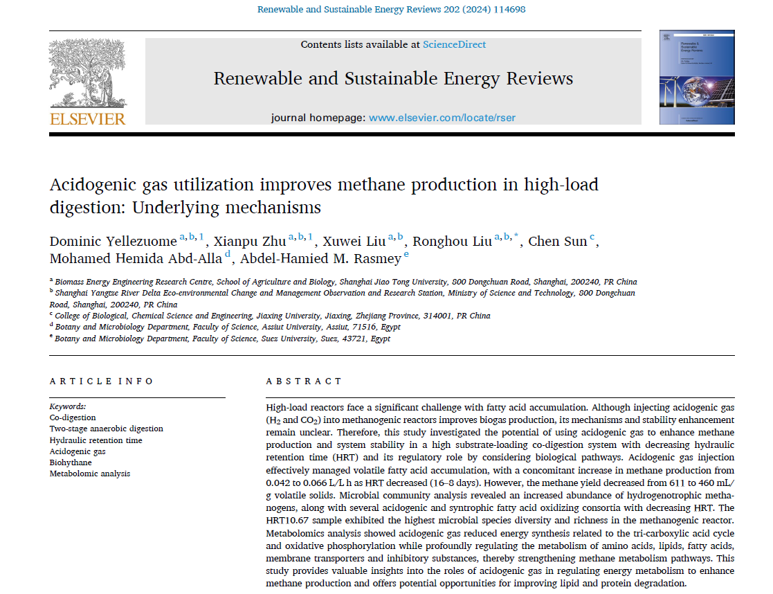 2024年06月21日,上海交通大学农业与生物学院生物质能工程研究中心长聘教授刘荣厚研究团队在绿色可持续发展领域知名期刊《Renewable and Sustainable Energy Reviews》(SCI,中科院一区,Top期刊,影响因子为16.3)正式发表了题为“Acidogenic gas utilization improves methane production in high-load digestion: Underlying mechanisms”(高有机负荷下产酸相气体产物利用对促产甲烷的潜在机理)的研究论文。
