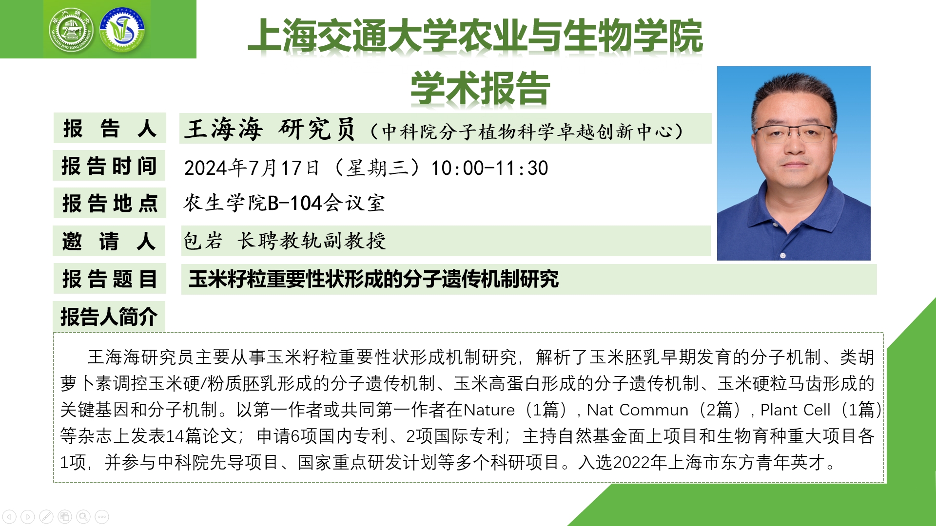 报告人 王海海 研究员(中科院分子植物科学卓越创新中心)