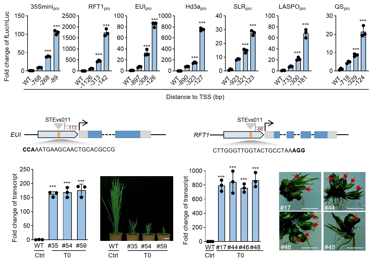 区别于Starr-seq技术,该研究首先开发了一种名为STEM的一种高通量筛选增强子的方法。为了大规模地从物种基因组中筛选出具有不同调控能力的增强子,该研究提供了一种含条形码载体系统,将每个条形码与候选增强子元件一一对应,通过测量条形码的丰度,获得候选增强子元件的激活倍数。基于STEM,通过分析水稻基因组中关键候选基因的启动子区域,研究团队鉴定了11610个候选STEs,并利用条形码介导的RNA-seq分析,成功鉴定了122个来自病毒及水稻的短增强子,其中来自病毒的增强子最高能够达到1000倍的激活效果,来自水稻内源的增强子最高能够达到66.6倍的激活效果,其中最短的增强子长度为40bp,大多数集中在100bp。该研究通过体外实验确定了STE插入的最佳位置,发现越接近转录起始位点(TSS),增强效果越强。在水稻多个不同基因中进行的目标敲入实验中,实现了高达176倍和869.1倍的基因表达上调,且该上调效果在多代中稳定遗传。