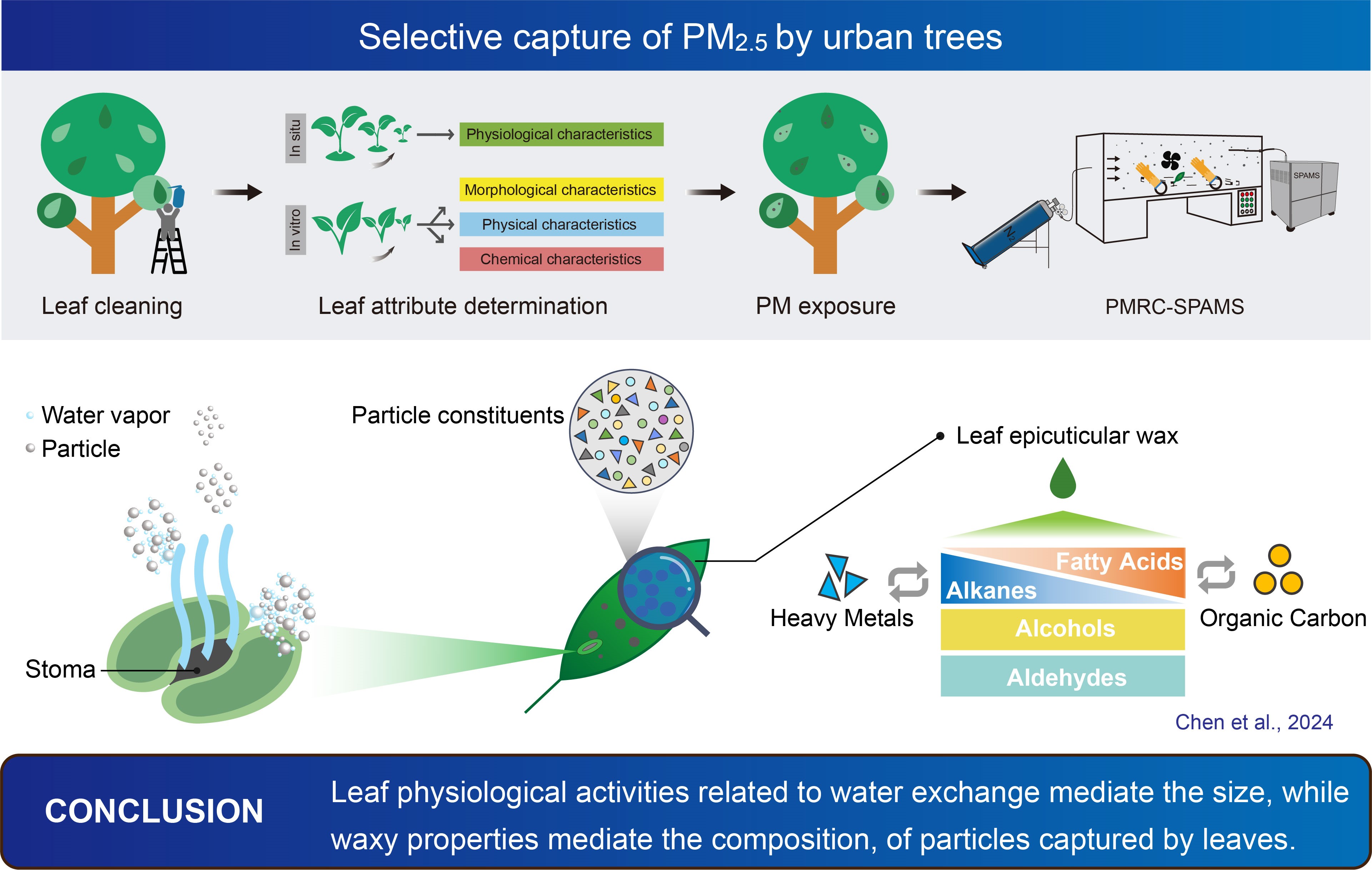 近日,上海交通大学农业与生物学院殷杉教授课题组在Journal of Hazardous Materials期刊发表题为''Selective capture of PM2.5 by urban trees: The role of leaf wax composition and physiological traits in air quality enhancement''的研究论文。研究通过颗粒物悬浮技术及单颗粒气溶胶质谱技术,对比分析了城市典型绿化树种叶片表面滞留颗粒的粒径及化学组成,揭示了城市森林对大气颗粒物的选择性吸附机制。
