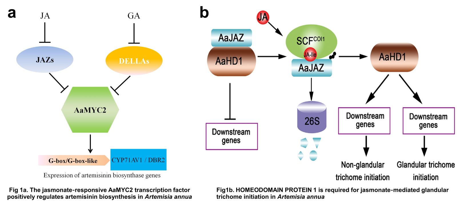 唐克轩教授研究团队长期从事青蒿素生物合成调控及腺毛发育研究工作,积累了丰富的青蒿研究技术手段,成功研制了多个高产青蒿素的青蒿品种。青蒿素是一种含有过氧桥键结构的倍半萜内酯次生代谢产物,其生物合成常常受到植物激素(茉莉酸、脱落酸等)、环境温度、气候等多种因素的影响。前期有报道发现,茉莉酸甲酯处理能够促进青蒿素的合成及提高青蒿叶片表面的腺毛密度,但茉莉酸信号途径参与调控青蒿素生物合成及青蒿腺毛发育的分子机理尚不清晰。
