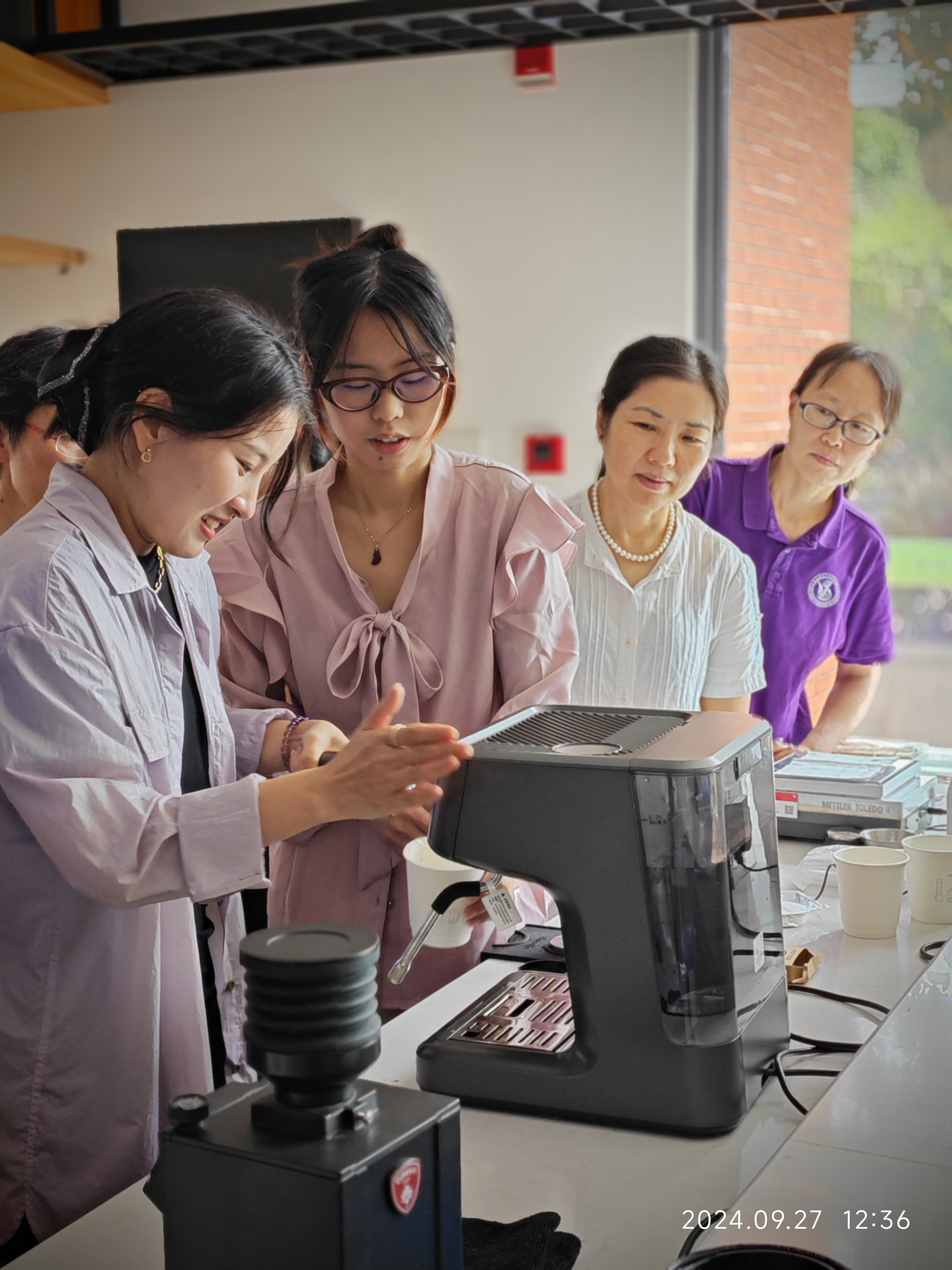“一九咖啡协会”的社员们兼职咖啡师,展示了意式咖啡的制作过程与手冲咖啡的冲泡技艺,老师们兴致勃勃,亲自体验萃取与拉花艺术。在咖啡的香气中,老师们不仅品尝到了美味的咖啡,还亲手体验了从豆子到杯子的全过程,感受了咖啡文化的深厚底蕴。