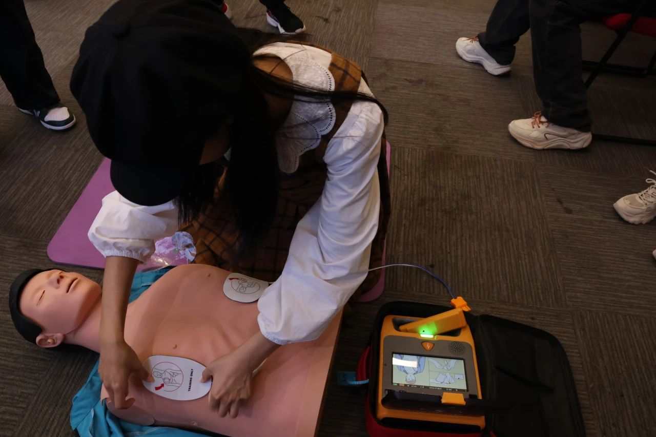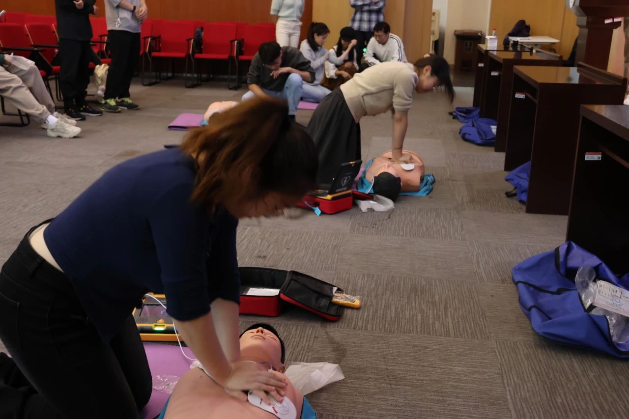 赵家鑫着重为同学们介绍了如何进行高质量心肺复苏的和使用AED,让每位到场同学在训练假人上进行演练。同学们跟随着老师的指导,一步步了解了心肺复苏的操作要领和AED的使用方法。同学们不仅学到了很多急救相关的理论知识,还在实践中掌握了基本的操作方法,从而为后续研究与生活中自己和他人的生命安全提供了保障。