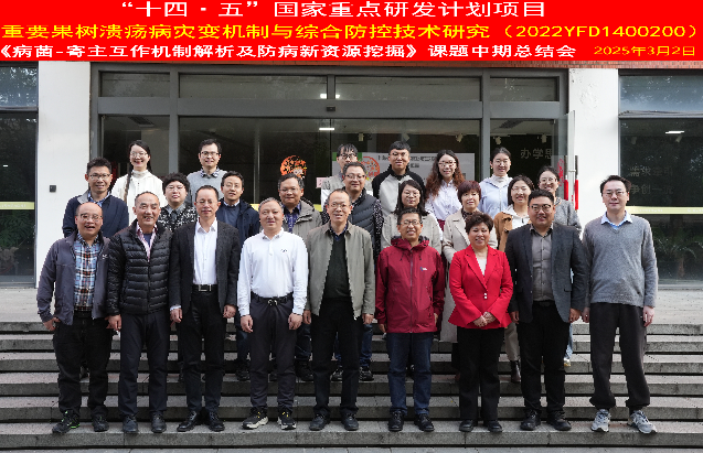 2025年3月2日,“十四·五”国家重点研发计划《重要果树溃疡病灾变机制与综合防控技术研究》(2022YFD1400200)课题“病菌-寄主互作机制解析及防病新资源挖掘”中期总结会在我校成功召开。