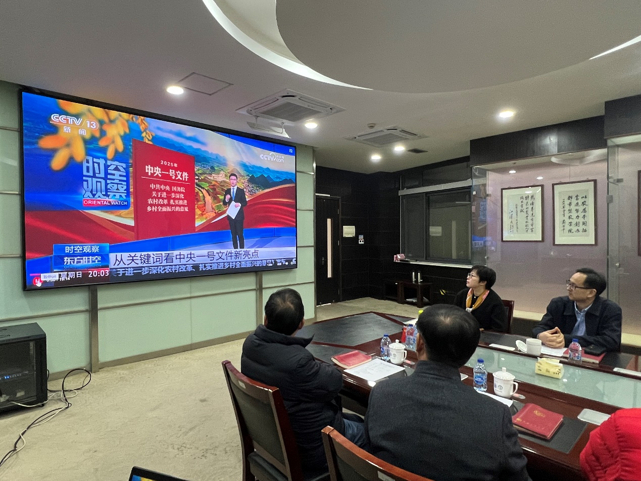 与会人员集体学习了2025年中央一号文件精神,观看了中央电视台专题节目《从关键词看中央一号文件新亮点》。党的十八大以来第13个指导“三农”工作的中央一号文件《中共中央 国务院关于进一步深化农村改革 扎实推进乡村全面振兴的意见》2月23日正式发布,全文共六个部分:持续增强粮食等重要农产品供给保障能力、持续巩固拓展脱贫攻坚成果、着力壮大县域富民产业、着力推进乡村建设、着力健全乡村治理体系、着力健全要素保障和优化配置体制机制。中央电视台专题节目聚焦“两个持续”和“改革”两个关键词对中央一号文件精神进行了深度解读。