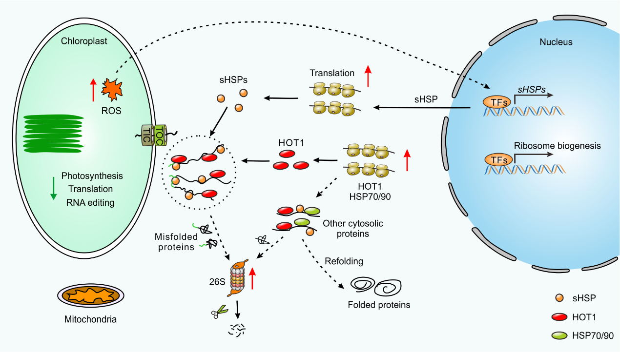 俗话说:万物生长靠太阳,植物的叶绿体是接收太阳光能,进行光合作用碳固定的细胞器。作为半自主性细胞器,叶绿体基因组只保留了少量蛋白编码基因,叶绿体内95%以上的蛋白都是在细胞质核糖体上合成前体蛋白,前体蛋白在其N端的叶绿体信号肽引导下进入叶绿体,而后信号肽被剪切掉形成成熟形式的叶绿体蛋白。因此,叶绿体的正常发育和功能发挥均依赖于叶绿体的蛋白内运过程。在高光、高温等逆境条件下,叶绿体的蛋白内运效率下降,会造成叶绿体前体蛋白在细胞质中大量积累,导致细胞质蛋白稳态失衡和胁迫,影响植物生长和作物产量。然而,植物如何响应叶绿体前体蛋白过量积累胁迫(chloroplast precursor overaccumulation stress,cPOS)目前还大部分未知。