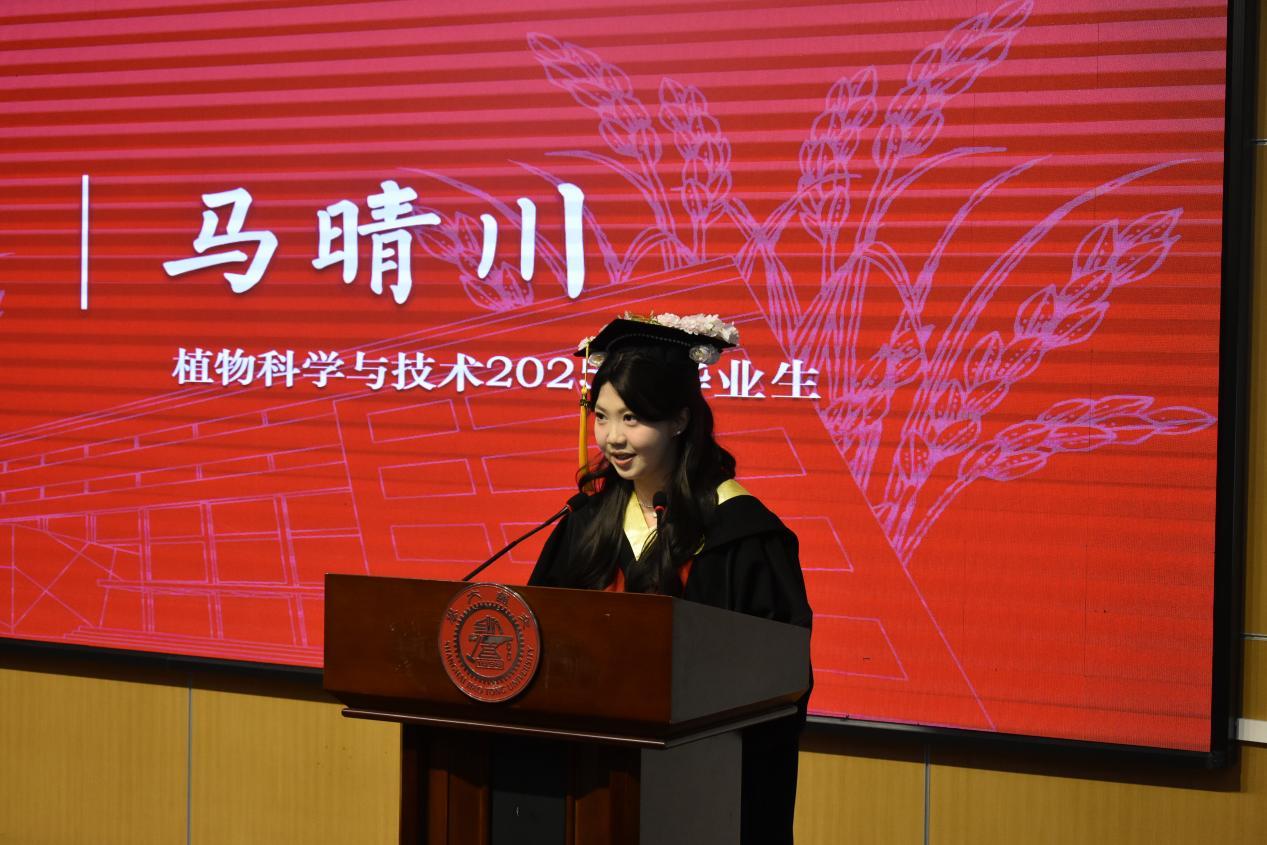 植物科学系马晴川代表毕业生发言,她从自己“弯腰”耕耘的本科经历入手,呼吁同学们向下扎根,厚积薄发,向上生长,触摸星空,用在交大沉淀的品质,书写属于自己的壮丽梦想。