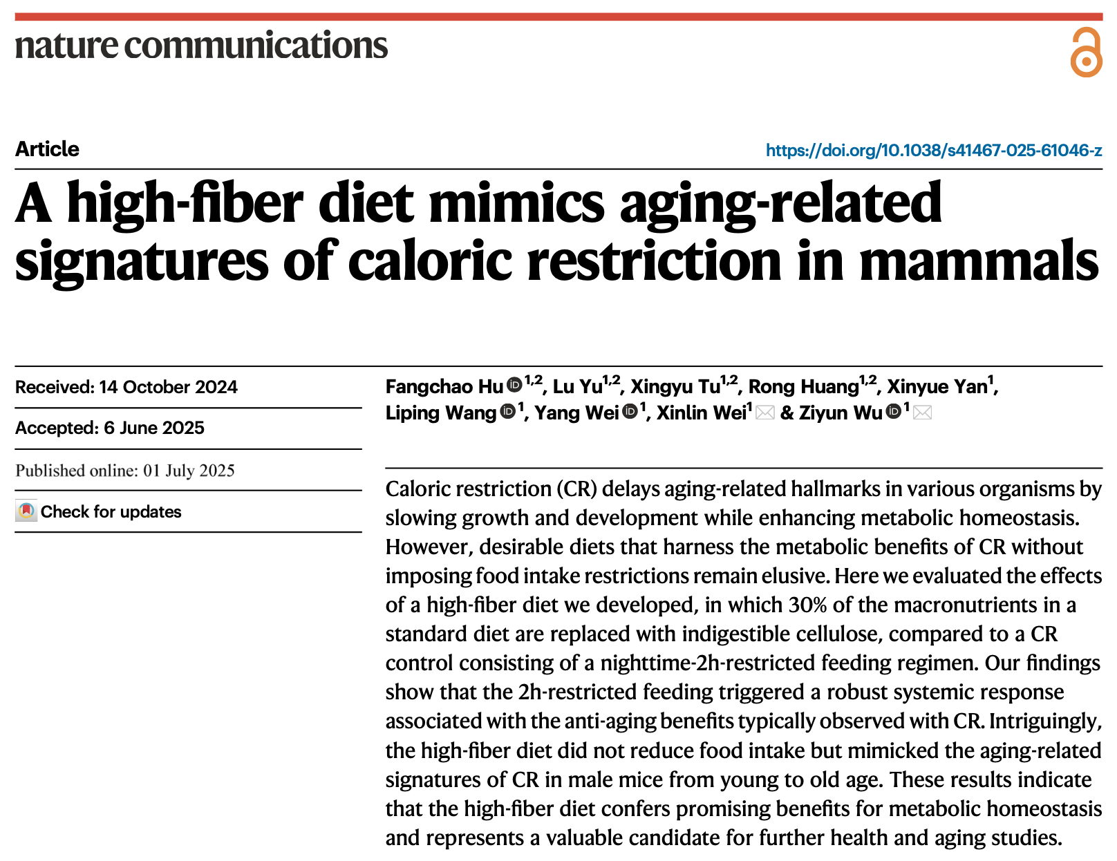 近日,上海交通大学农业与生物学院吴紫云团队在国际权威综合性期刊Nature Communications上发表了题为"A high-fiber diet mimics aging-related signatures of caloric restriction in mammals"的研究论文,发现特定高纤维饮食在不限制摄食和不影响生长的情况下精准复制CR的抗衰效应,为开发基于膳食纤维的抗衰老产品提供了坚实的分子基础和临床转化路径,为开发新型抗衰老膳食策略提供理论依据。