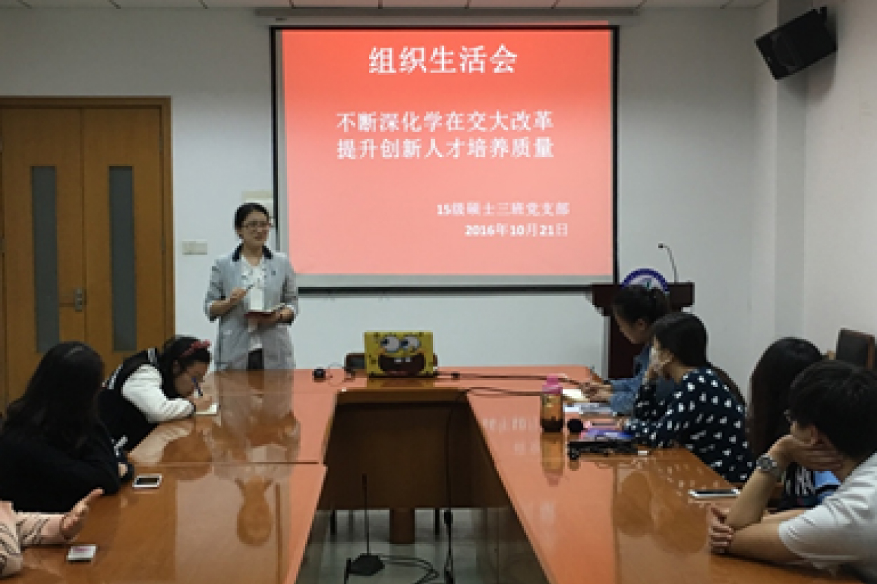 10月21日 ,农业与生物学院15级硕士第三党支部在农业与生物学院0-103会议室召开支部生活会,会议主题为“不断深化学在交大改革,提升创新人才培养质量”,会议由支部书记李想主持。