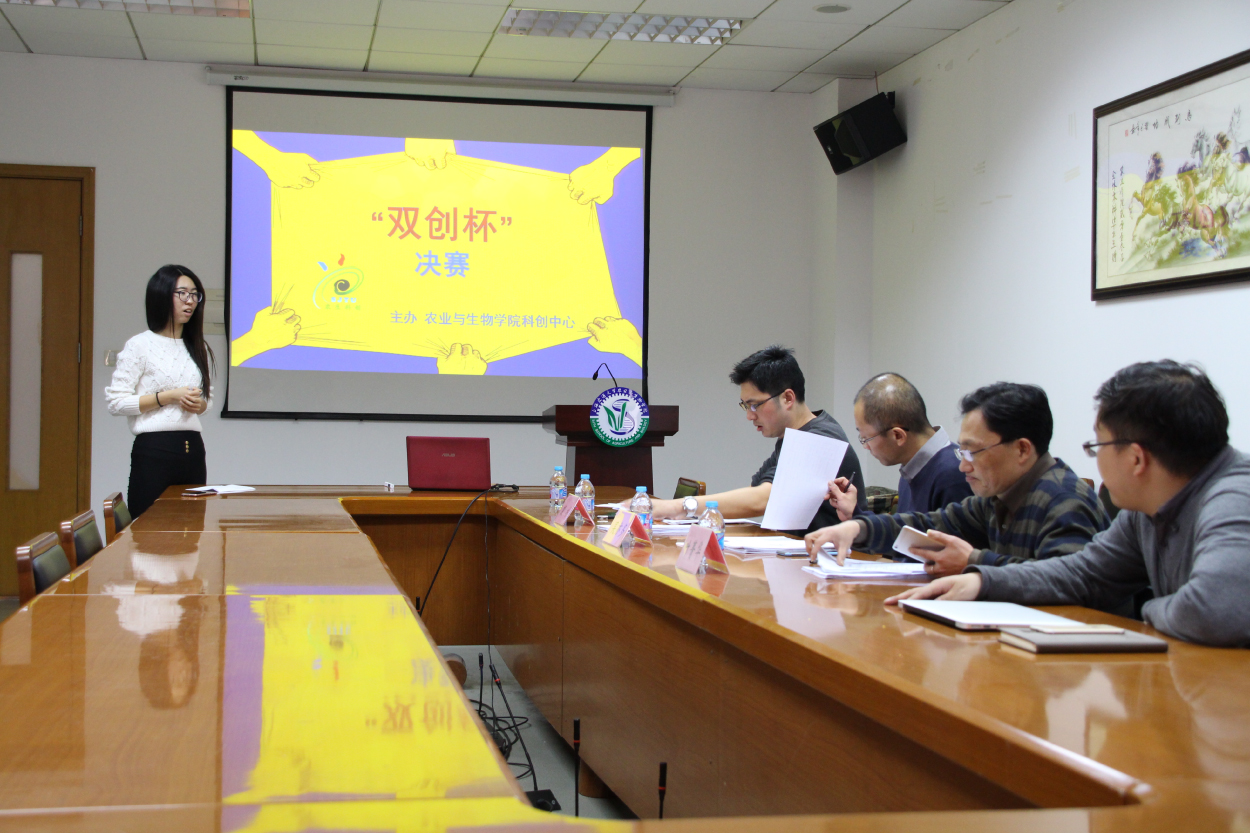 为进一步传播科学思想,弘扬科学精神,响应国家大众创业,万众创新的号召,培养我院学生的创新精神和创业实践能力,农生学院“双创杯”创新创业比赛于12月1日下午在院0-103会议室举行。本次比赛由科创中心主办,邀请风景园林殷杉老师、上海交大科技园有限公司吴亦多、叶菁华老师担任评委。经过激烈角逐,最终十二支队伍进入决赛,展开最后的巅峰对决。决赛由项目路演及评委答辩两部分组成,按照评委分数产生获奖团队。