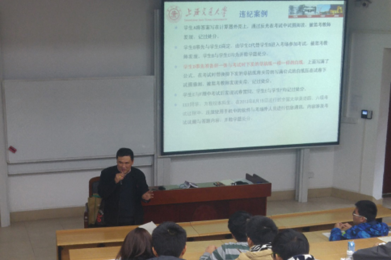 2016级年级思政教师陆小毛向全体学生播放了《诚信教育漫画展示》专题幻灯片,并结合近几年来发生校内发生、处理的考场违纪作弊典型案例,向学生逐条解读《上海交通大学学生考试纪律规定》以及一旦违反规定后所收到的相应纪律处分,教育学生认真备考、诚信考试,以饱满的精神面貌进入考场,千万不要触碰《上海交通大学学生考试纪律规定》所列的各类违纪、作弊行为。