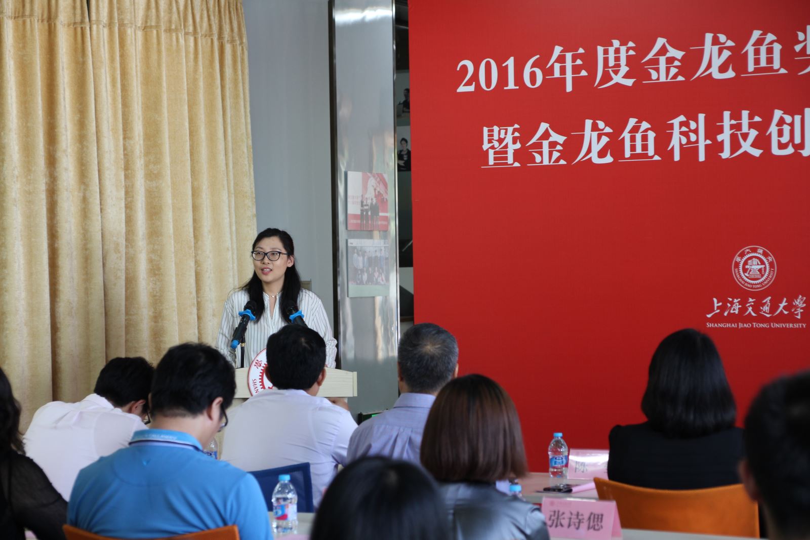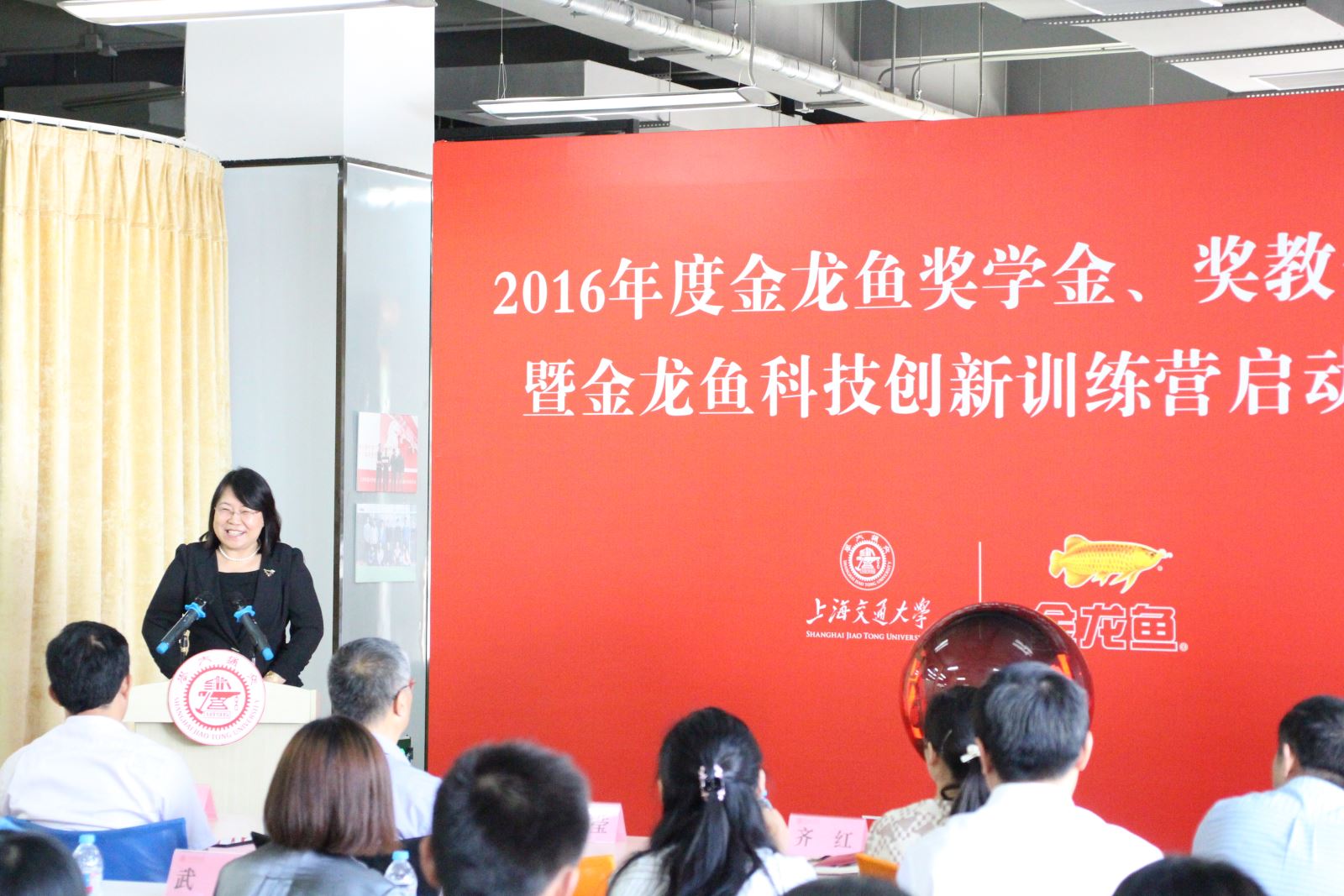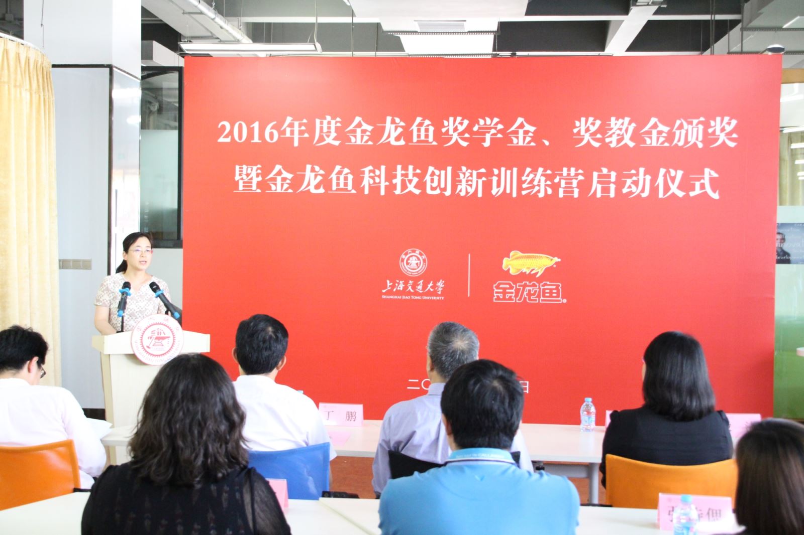 2017年6月2日,上海交通大学2015-2016年度金龙鱼奖学金、奖教金颁奖仪式暨金龙鱼科技创新训练营启动仪式在闵行校区逸夫科技楼创新创业实验室举行。益海嘉里集团研发中心专业副总监陈莹、农业与生物学院党委书记齐红、校发展联络处副处长殷洁、校团委副书记武超、校学生事务中心副主任程茵、学院食品系系主任史贤明教授以及获奖师生和学院创新创业团队同学等出席了仪式。仪式由学院党委副书记龚强主持。
