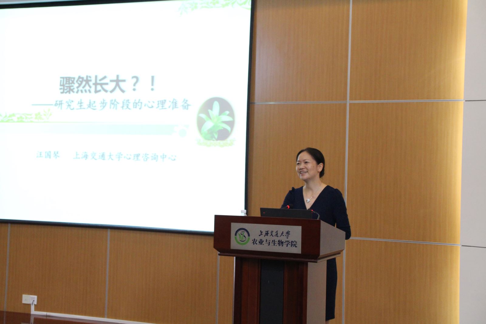 为解决新生个性、学习与工作、两性与人际交往等心理健康问题,树立正确的人生观价值观,9月20日中午,农业与生物学院在学院报告厅举办了以“骤然长大——研究生起步阶段的心理准备”为主题的心理健康教育讲座。学校心理咨询中心副主任汪国琴老师应邀担任主讲嘉宾,学院人才培养办副主任金丽鑫老师及全体2017级研究生新生参加活动。