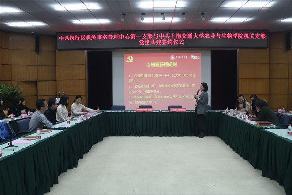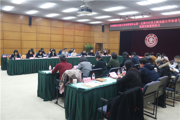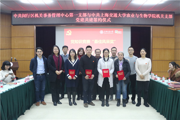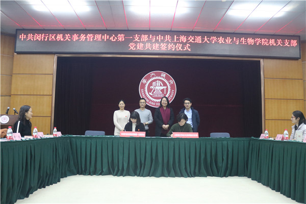 为深入贯彻落实十九大会议精神,全面开展基层党组织结对共建活动,着力构建基层党支部工作新格局,1月19日,农业与生物学院机关党支部与闵行区机关事务管理中心第一党支部在钱学森图书馆开展支部联合共建活动,并签署合作共建协议。闵行区机关事务管理中心党总支书记吴忆多、副书记赵黎,总支委员、第一党支部书记李群,农业与生物学院党委书记齐红、副书记龚强,机关党支部书记贾严宁,双方支部成员近40人参加活动。