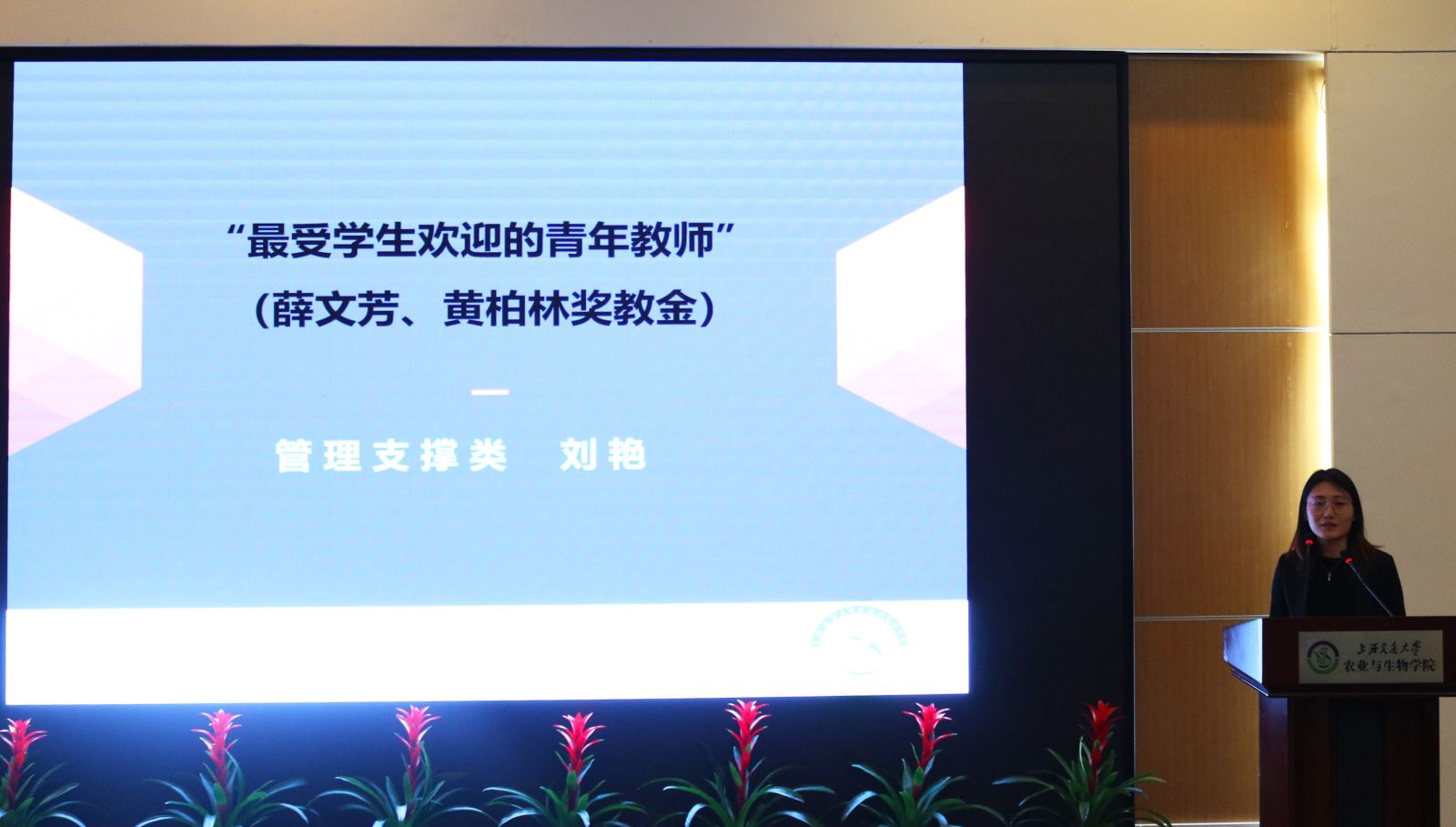 “农业与生物学院最受学生欢迎的青年教师暨薛文芳、黄柏林奖教金”由台湾技高工业集团董事长黄铭玉先生设立,旨在表彰学院优秀的青年教师,促进形成尊师重道的良好氛围。